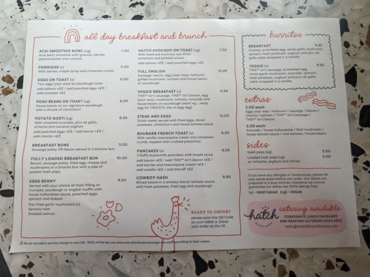 One of the standout offerings is their “Hatch Big Brunch”-a generous plate loaded with sausage, bacon, hash browns, eggs your way, roasted mushrooms, and beans. It’s a classic, but done better. Vegan and gluten-free options are thoughtfully included, like the “Vegan Breakfast Burrito”, which is flavorful and filling without compromising on quality.
